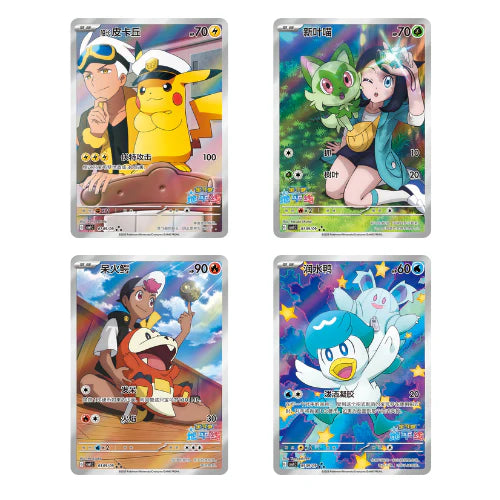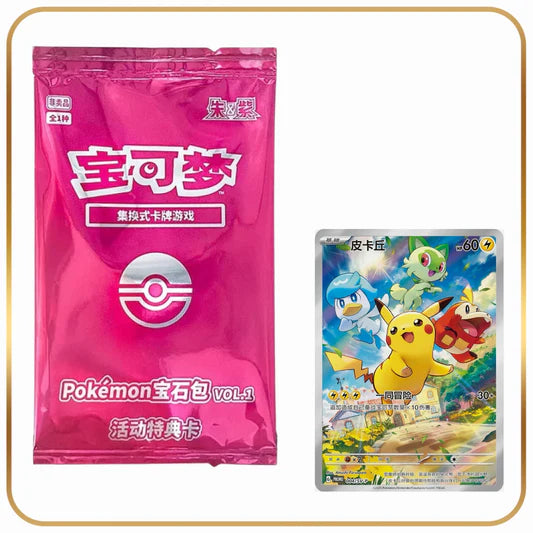 The Gem Pack Booster Box is a first-of-its-kind booster pack for Simplified Chinese Pokémon. It’s full name being “Gem Pack Vol. 1“. With the launch of the Scarlet & Violet era in Pokémon China, a new pack with various foil designs, stamped promo cards and never-seen-before illustration cards have been revealed. This pack is the first booster pack that Simplified Chinese Pokémon products have moved to a new rarity system too, much like you would see in the English Pokémon Cards. The four chase cards of this promo pack feature characters you know and love from Pokémon Horizons, and include a Pokémon Horzions stamp.